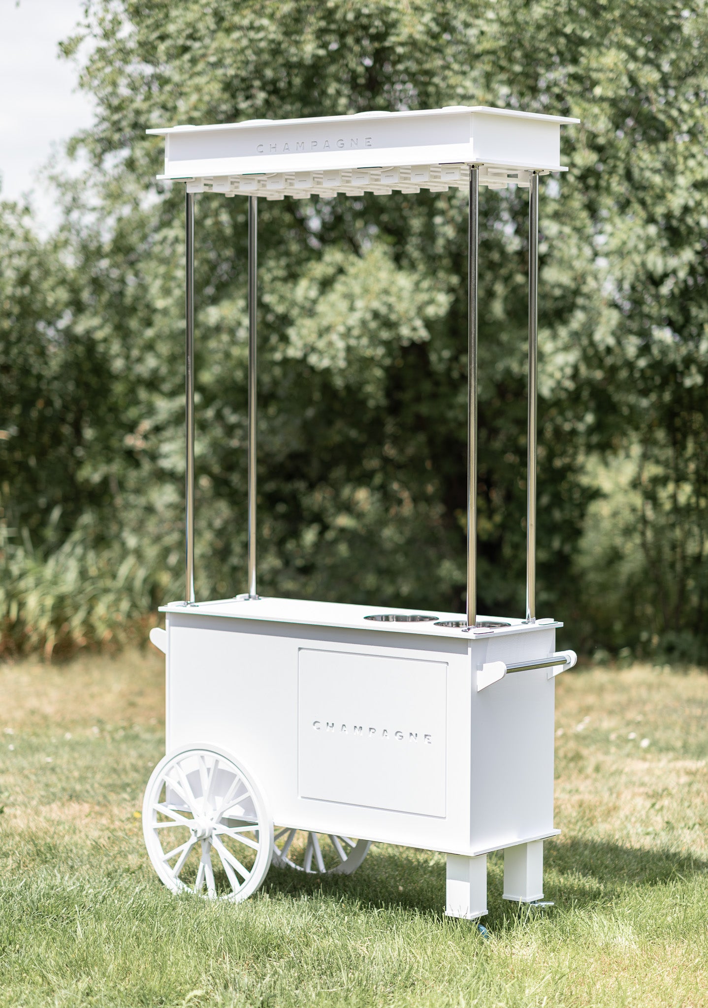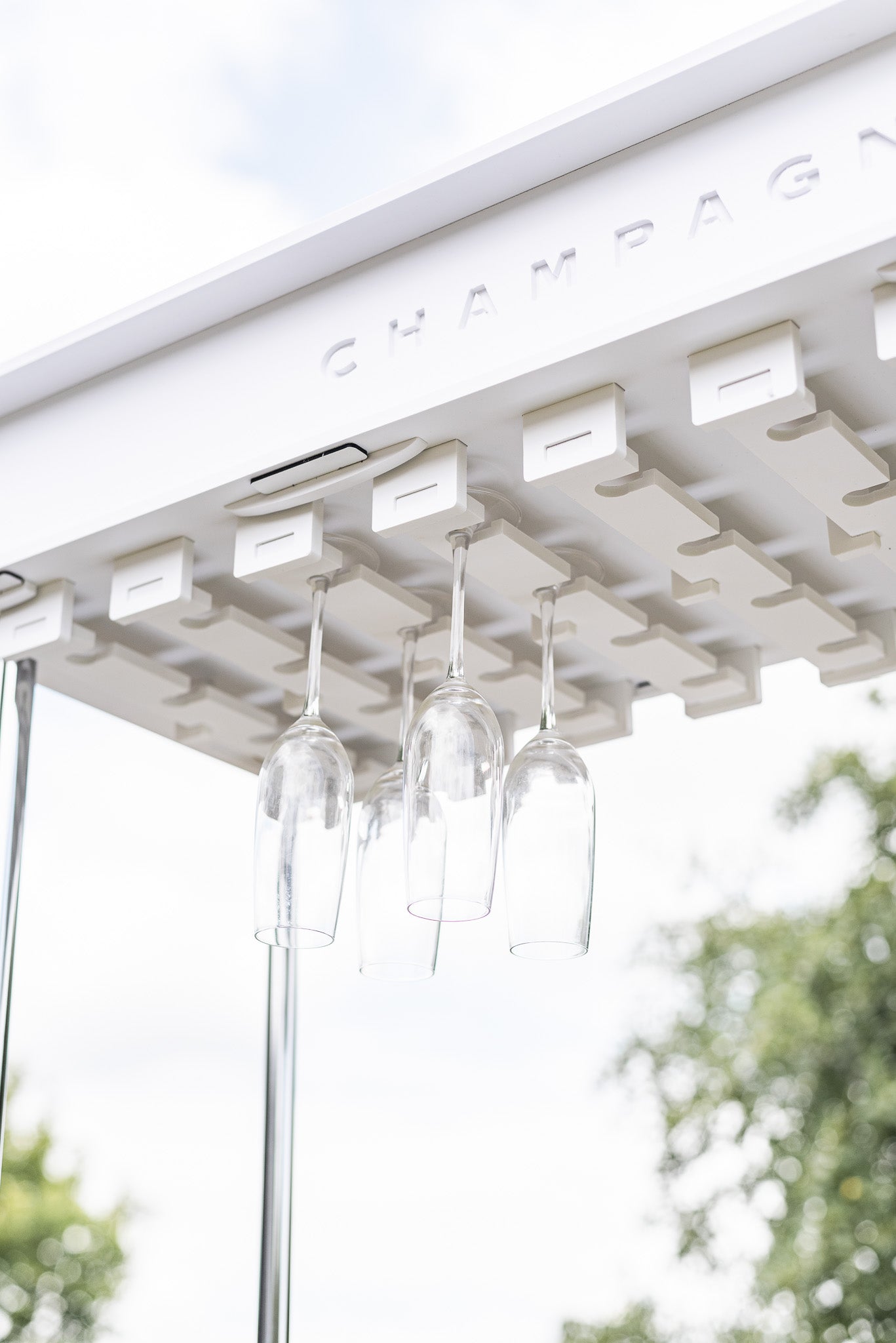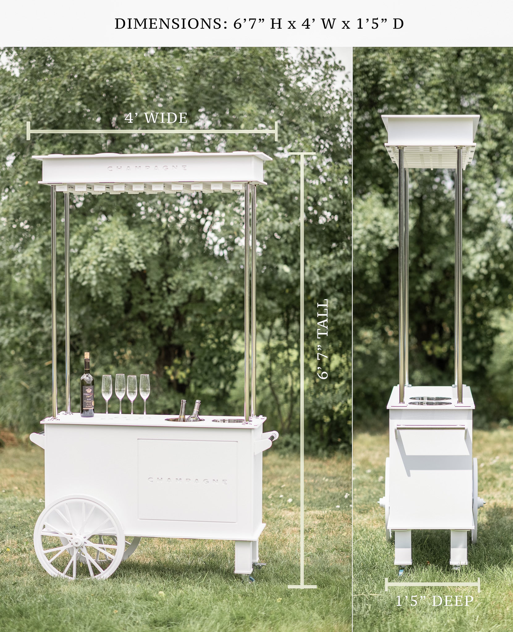 This opulent mobile champagne cart is the epitome of sophistication, designed to elevate any event or celebration. It holds 40 champagne flutes and is made out of PVC plastic, making it waterproof and lightweight for transporting. The poles, handle bars and buckets are made out of steel metal. This champagne cart promises to be the centerpiece of every occasion, serving bubbly delights with finesse and charm.